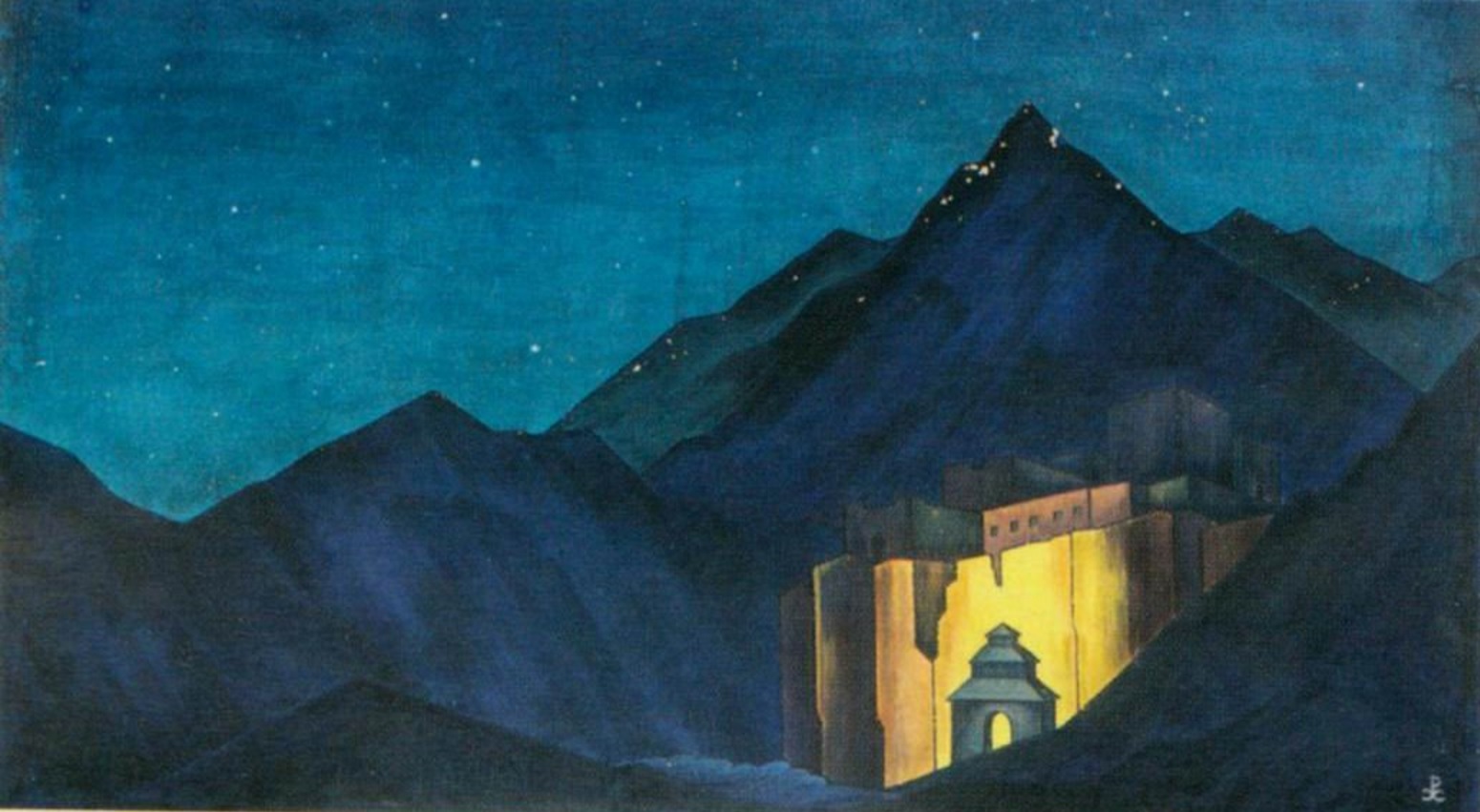 Nicholas Roerich是个俄国人,在喜马拉雅两麓奔波了很多年,他的许多雪山作品充满魔幻色彩,比如这张似乎是描绘魔山之门的,另外还有一张《信使》也极精彩。看过他的大量真迹,流连忘返。