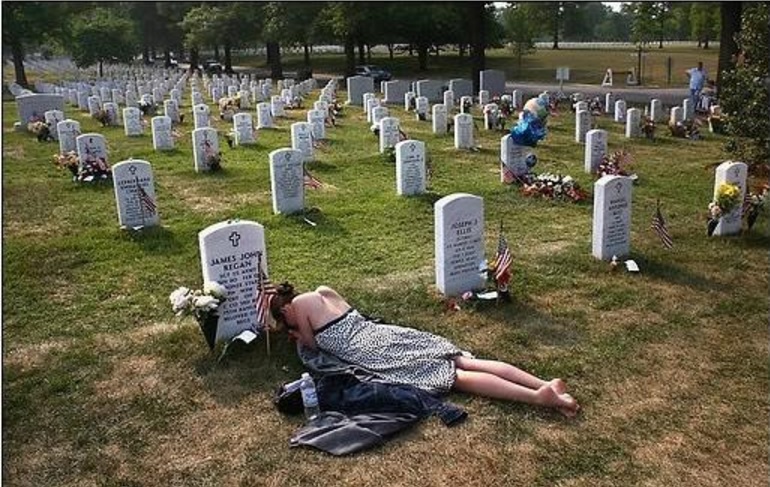2007年5月27日,美军牺牲纪念日,艾灵顿国家公墓,一名女子第一次在她丈夫的墓前哭泣。