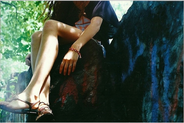阳光透过绿叶,姑娘坐着自在。