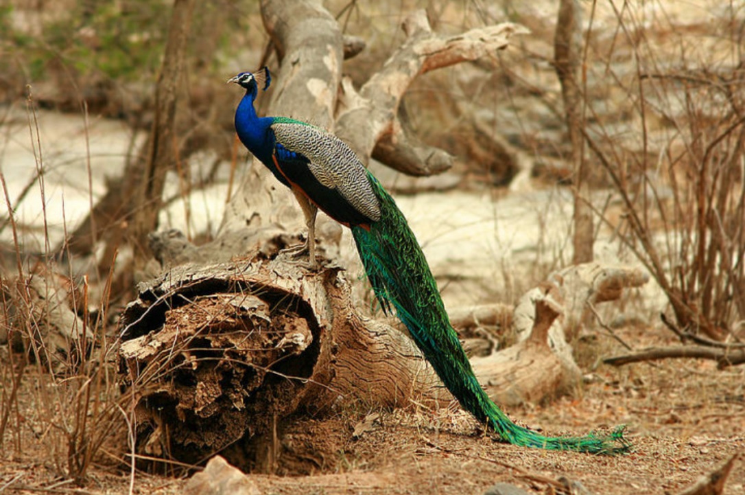 孔雀在林中。孔雀不但能飞,还能飞得挺高挺远的。